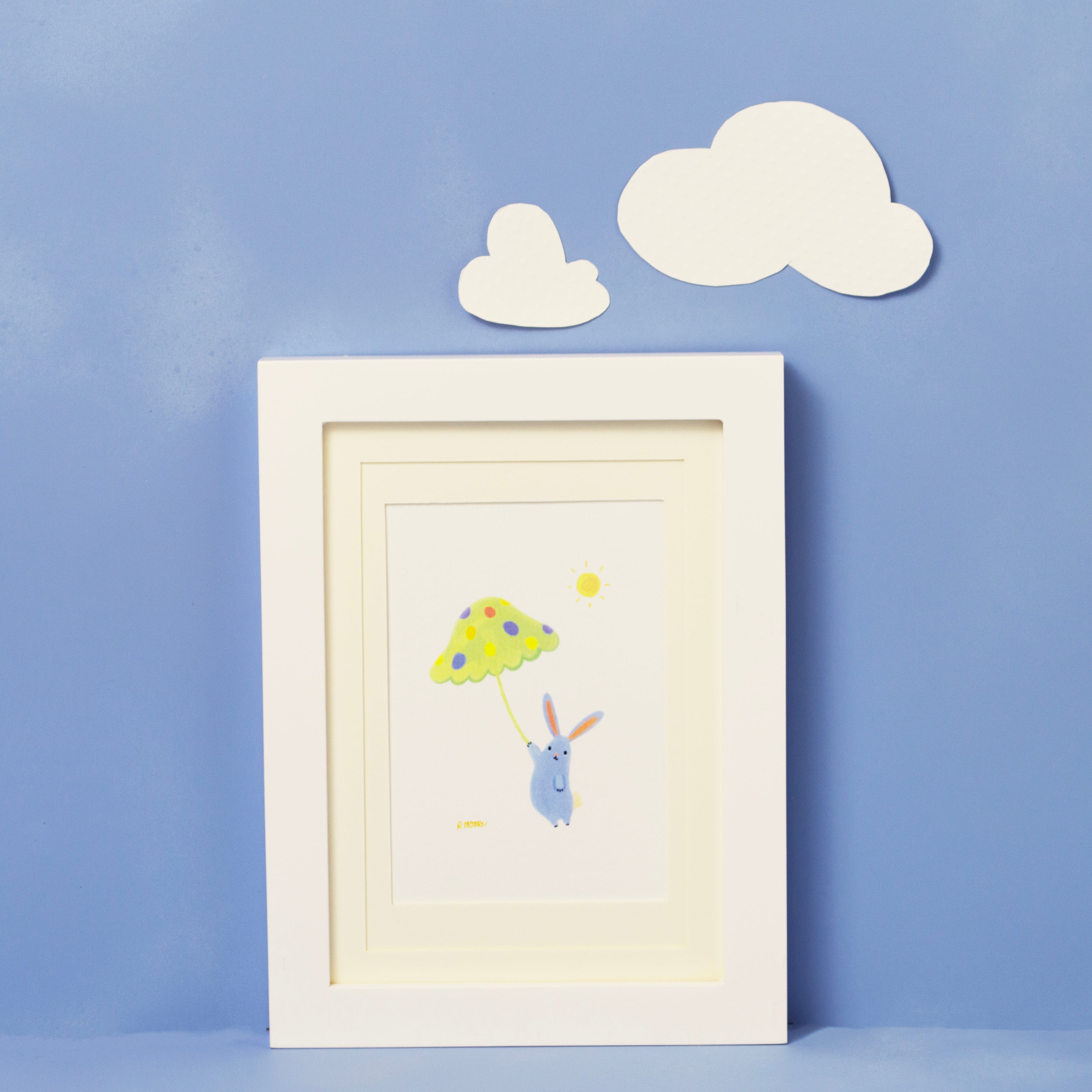 Inspired by our original designs, you'll love this clever bunny in our framed print, Bunnies with Ideas. The artwork adds warmth and charm to any nursery and can be grouped with other pieces in the collection. A 6"x8" solid wood frame hangs on a wall or sits on a dresser, and double matting gives a polished finish.