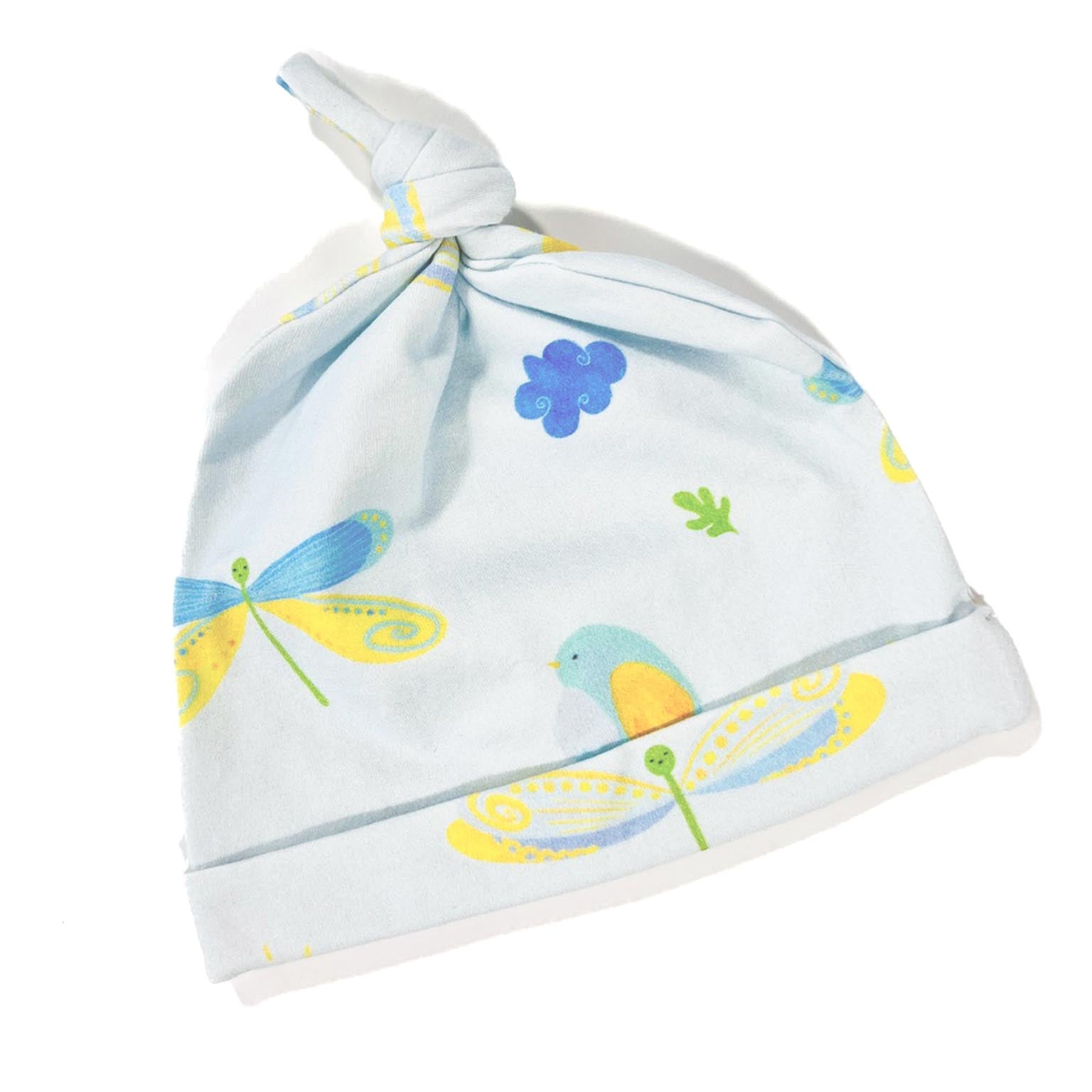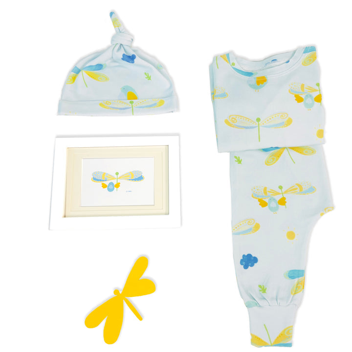 This adorable baby gift set includes a cozy playset with raglan sleeves, harem pants, with a matching beanie, all made from soft, OEKO-TEX® Standard 100 certified organic cotton knit. Finishing the gift trio is our lovely 6"x8" solid wood framed Dragonflies and Tweety Birds print, inspired by our original designs. It's a charming addition to baby's room whether displayed on the dresser or hung on the wall. Or, choose a different framed artwork from one of our other original collections (featured below) to complete this gift set. Sizing chart